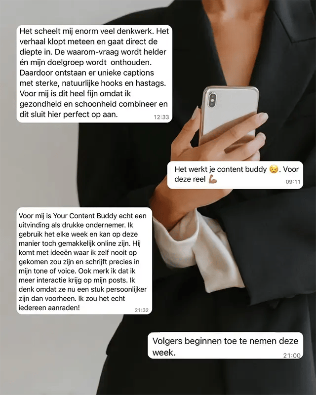 Voor mij is Your Content Buddy echt een uitvinding als ondernemer. Ik gebruik het elke week en kan op deze manier toch gemakkelijk online zijn. Hij komt met ideeën waar ik zelf nooit opgekomen zou zijn en schrijft precies in mijn tone of voice. Ook merk ik dat ik meer interactie krijg op mijn posts. Ik denk omdat ze nu een stuk persoonlijker zijn dan voorheen. Ik zou het echt iedereen aanraden!